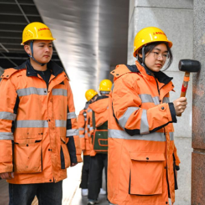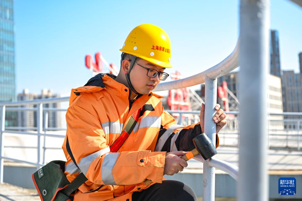在上海站站房屋面上,有一群身着橘黄色工作服的巡检工在忙碌,他们是上海房建公寓段上海房建班组第一分队的房建巡检工。除了队长郭宇轩外,其他队员均为“00后”,最年轻的年仅21岁。这群“00后”房建巡检工今年也迎来了他们职业生涯中的第一个春运。