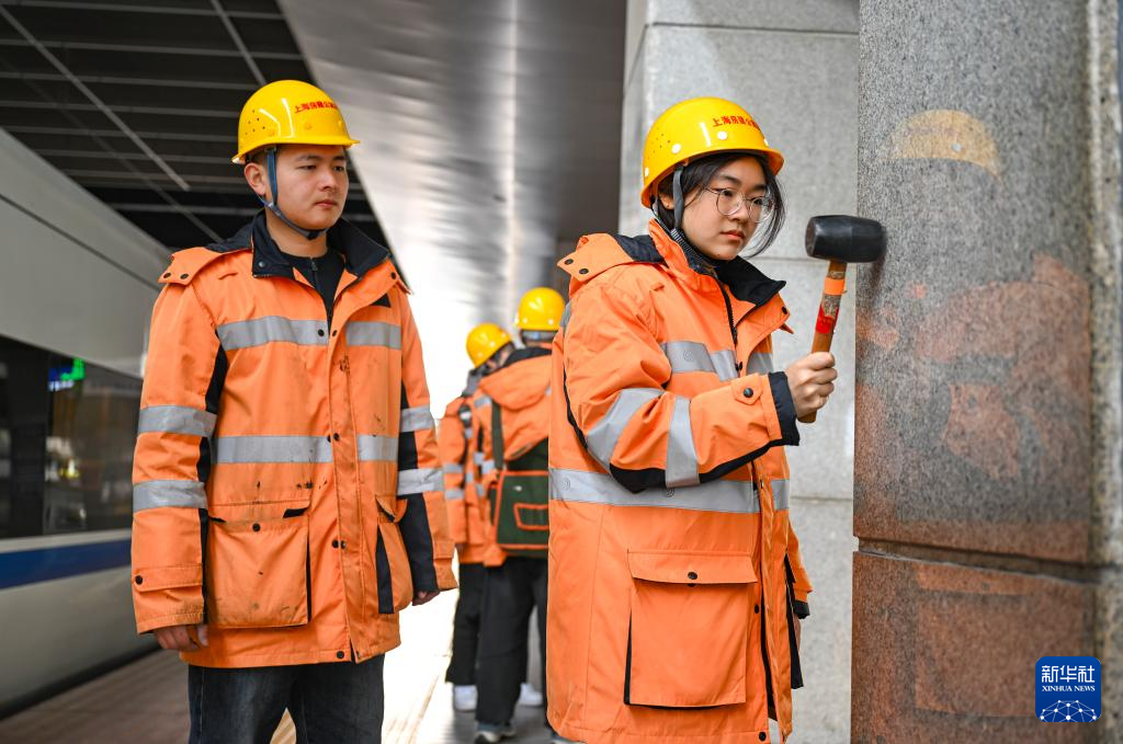 1月22日,房建巡检工夏忻怡(右)在上海火车站检查站台立柱干挂大理石。