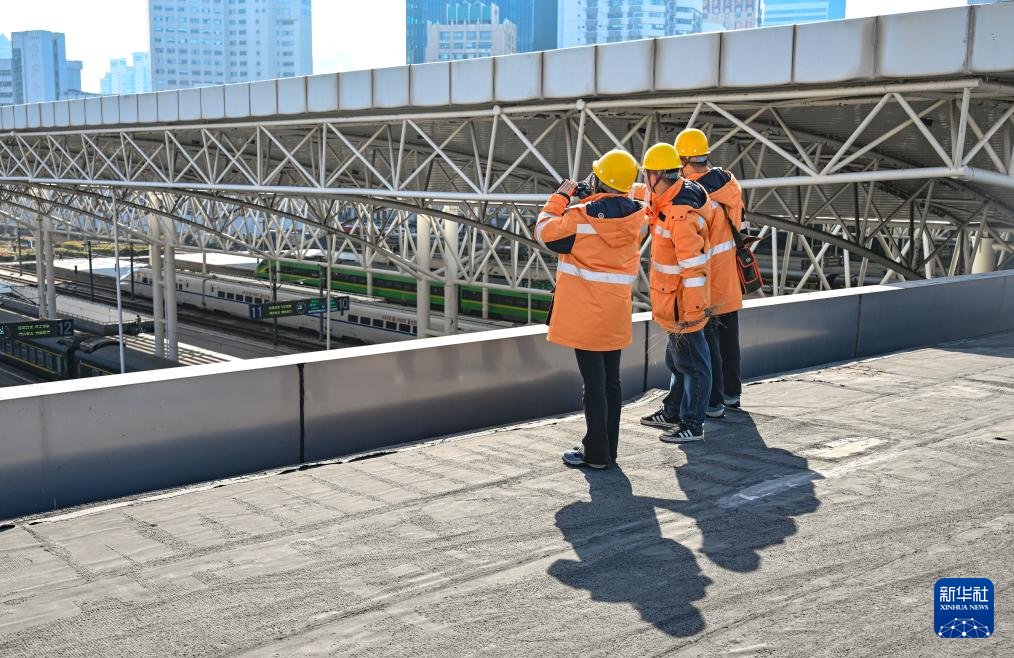 1月22日,房建巡检工高宇轩在上海火车站对站房屋面护栏检查。
