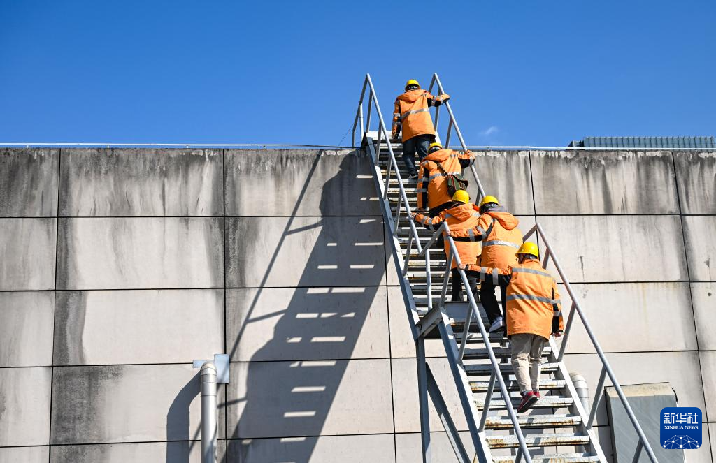 1月22日,房建巡检工在上海火车站利用陡峭钢梯爬向上海火车站站房屋面。
