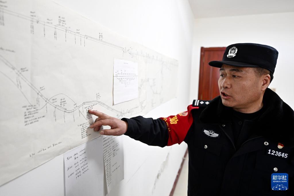 1月21日,马永东在六盘山警务区介绍自己手绘的辖区线路警情图。