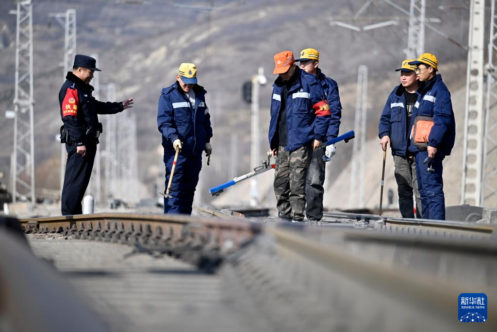 1月21日,马永东(左一)在辖区巡线时向工务段工人了解线路安全情况。