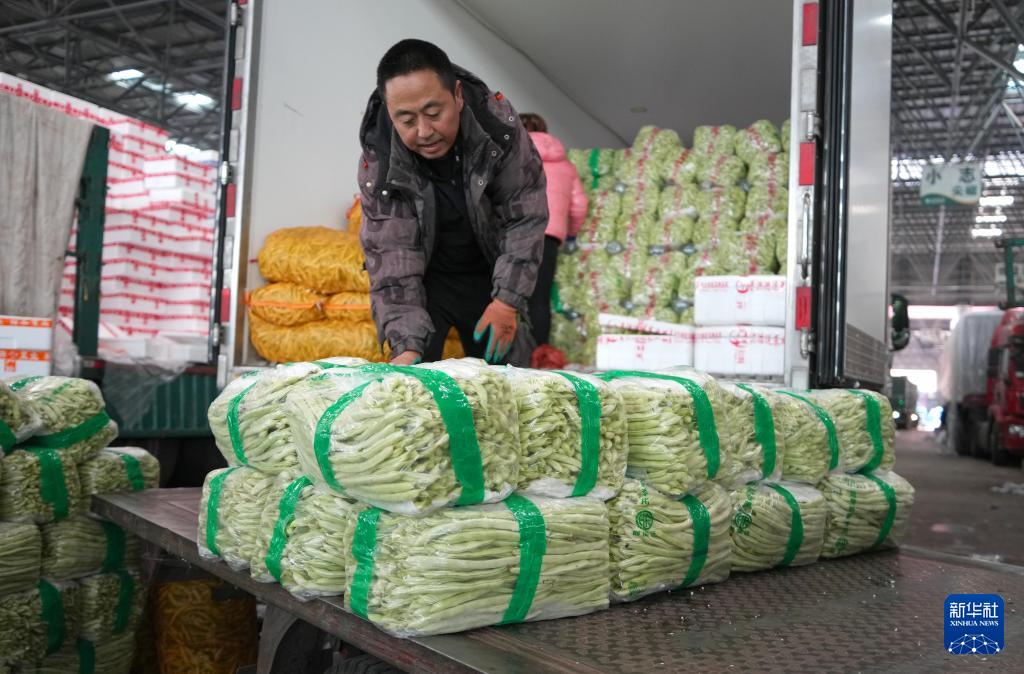 1月22日,在位于山东省寿光市的寿光地利农产品物流园,工作人员在装运蔬菜。