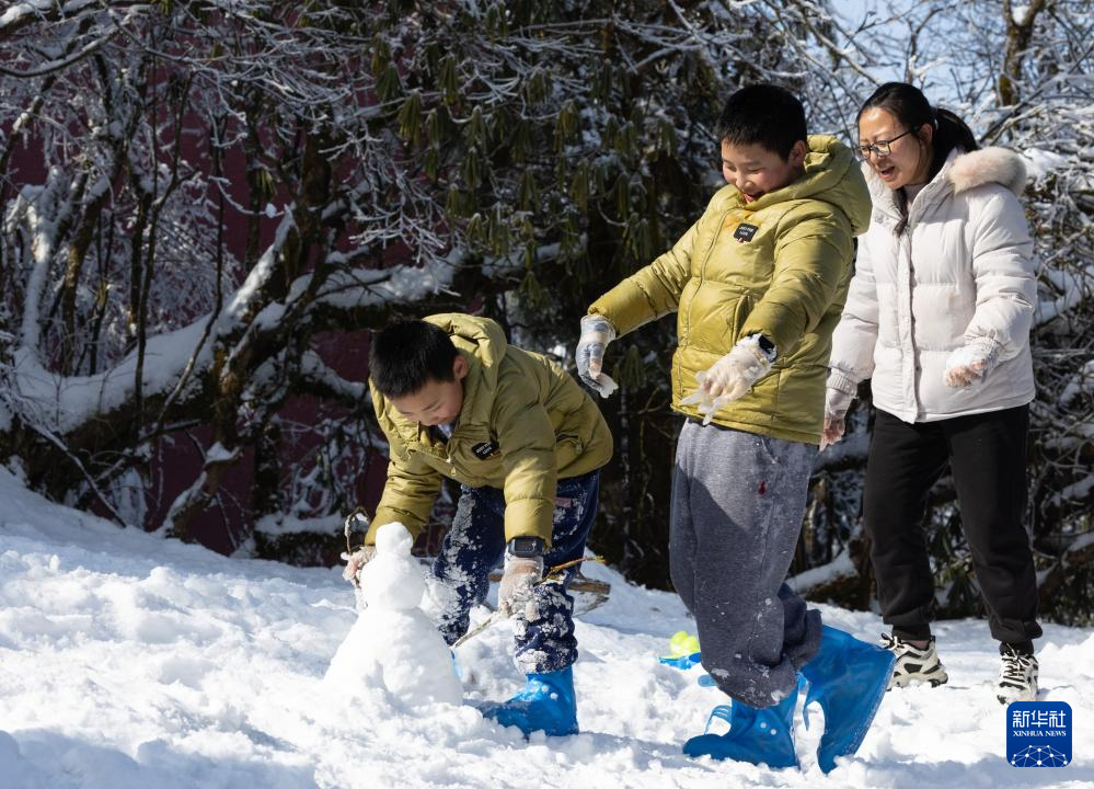 1月12日,在四川峨眉山景区,小朋友在堆雪人。