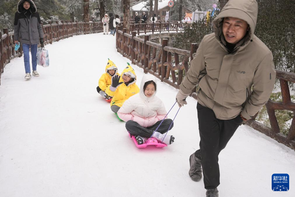 1月14日,在位于四川省洪雅县的瓦屋山景区,家长拉着雪板带着孩子在雪地滑行。