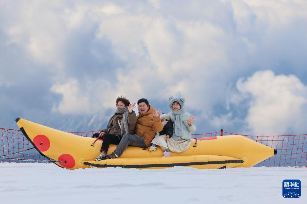 1月11日,在四川省石棉县王岗坪景区,游客在雪地里体验“雪地香蕉船”。