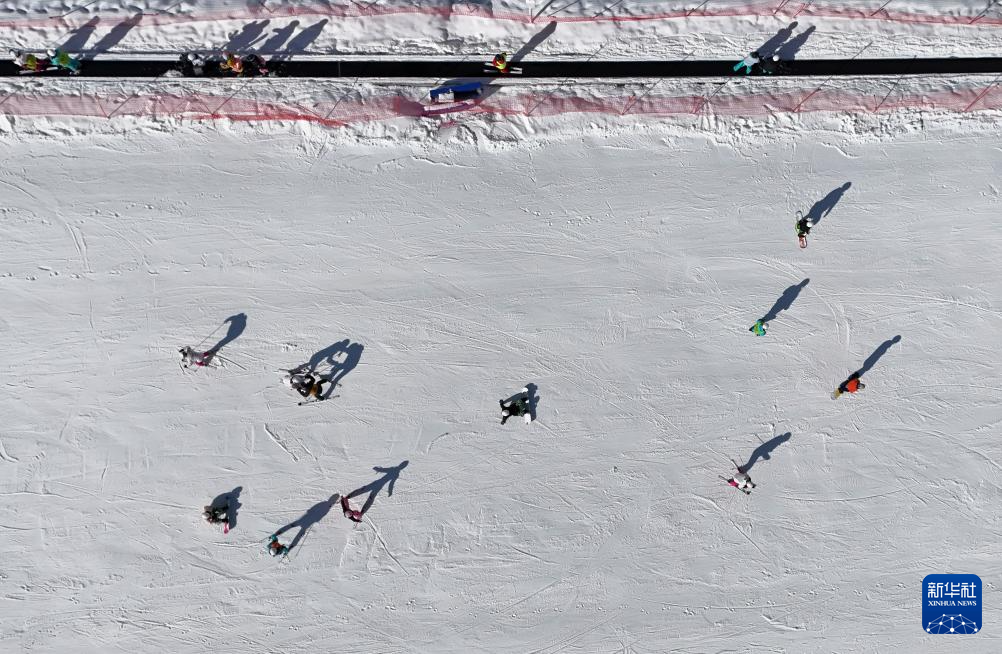 1月9日,滑雪爱好者在四川省阿坝藏族羌族自治州汶川县羌人谷滑雪场滑雪(无人机照片)。