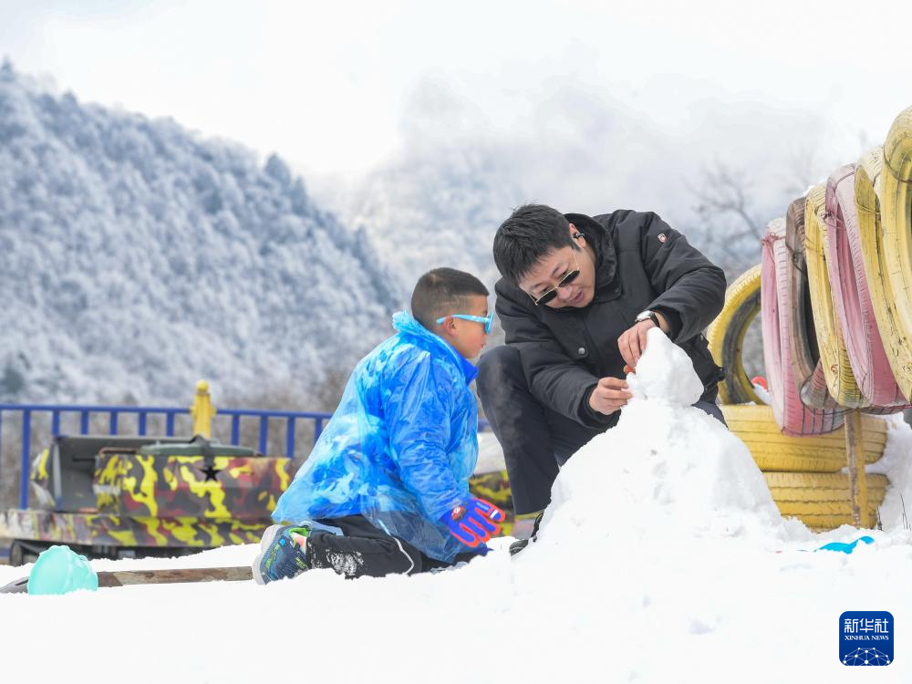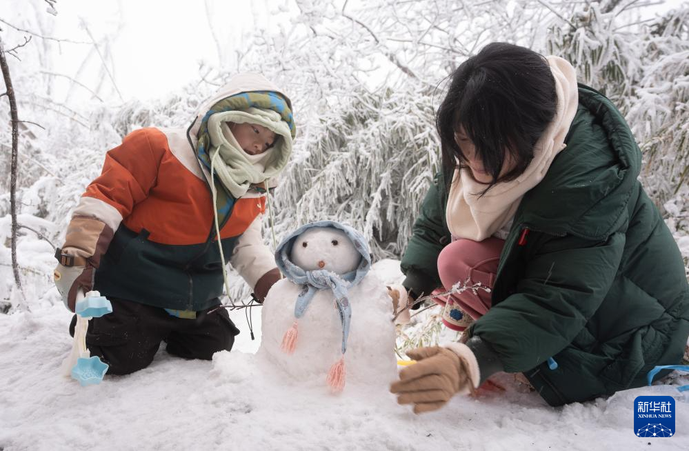 1月11日,在成都市大邑县西岭雪山,游客带着孩子堆雪人。