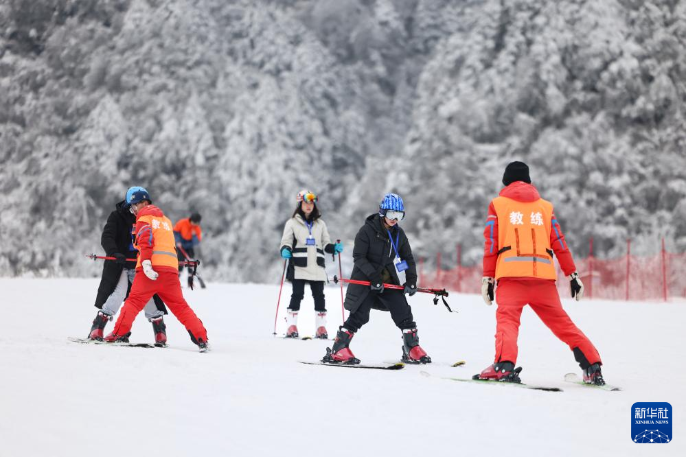 1月11日,在四川省石棉县王岗坪景区,滑雪爱好者在教练引导下学习滑雪。