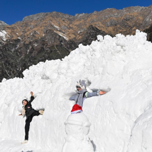 1月10日,在四川省石棉县王岗坪景区,游客在堆雪人。