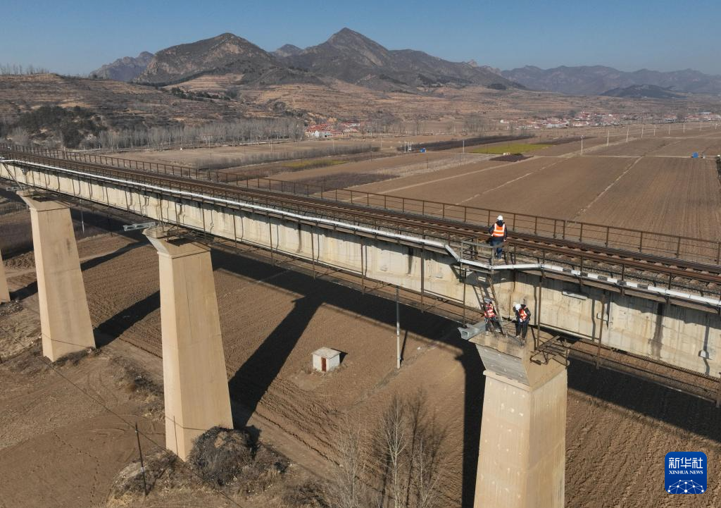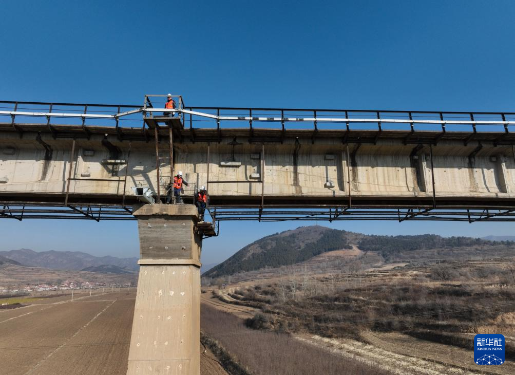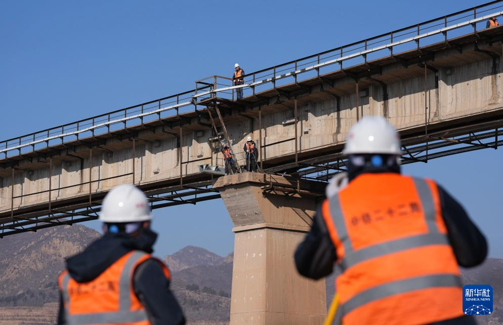 1月23日,中铁二十二局的建设者在河北省承德市围场满族蒙古族自治县的换梁施工现场作业。