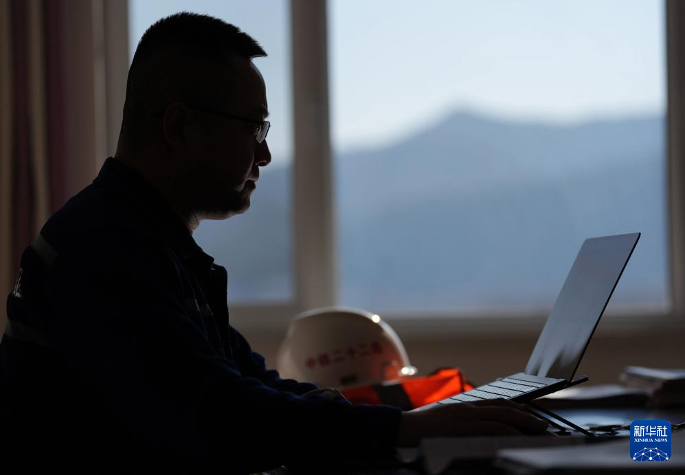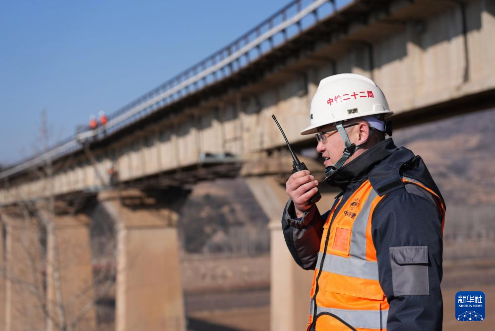 1月23日,姜跃龙在河北省承德市围场满族蒙古族自治县的换梁施工现场通过对讲机和同事交流。