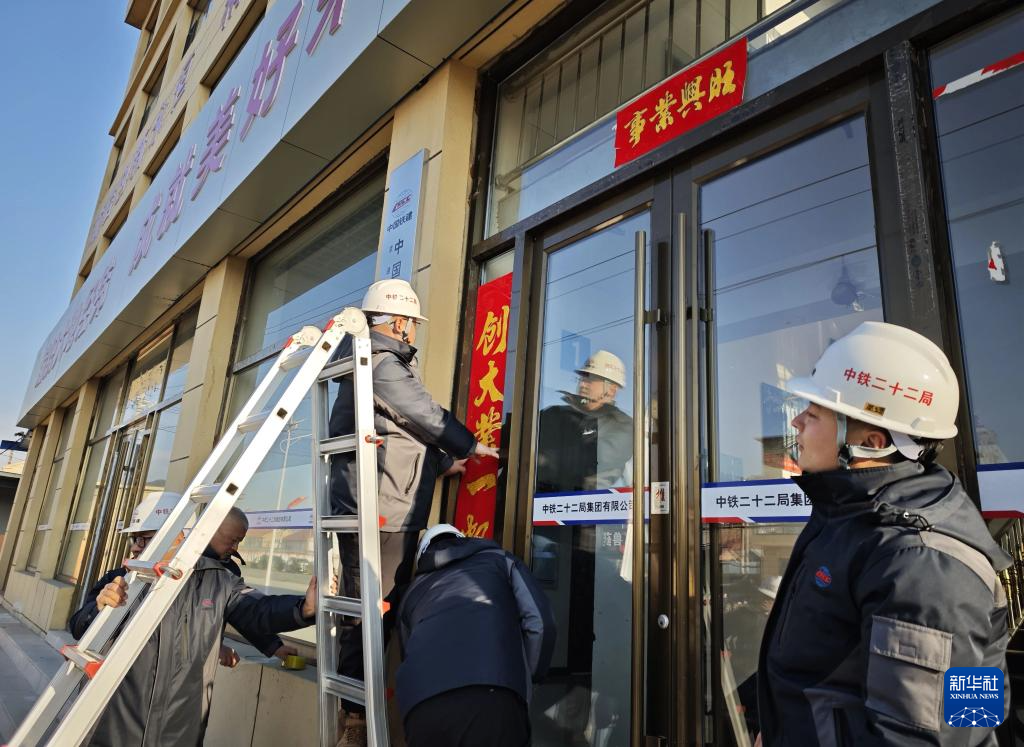 1月23日,姜跃龙(右三)在项目部和同事贴春联。