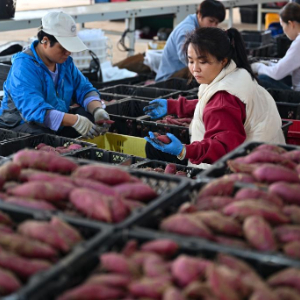 1月23日,工人在文昌市铺前镇分拣地瓜。