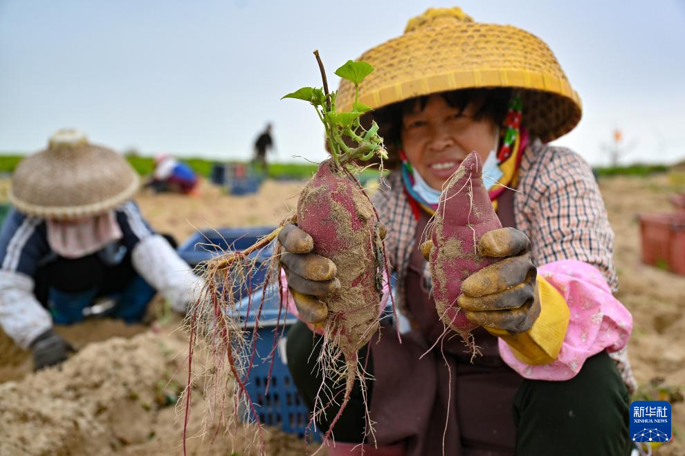 1月23日,工人在文昌市铺前镇田间展示刚挖出的地瓜。