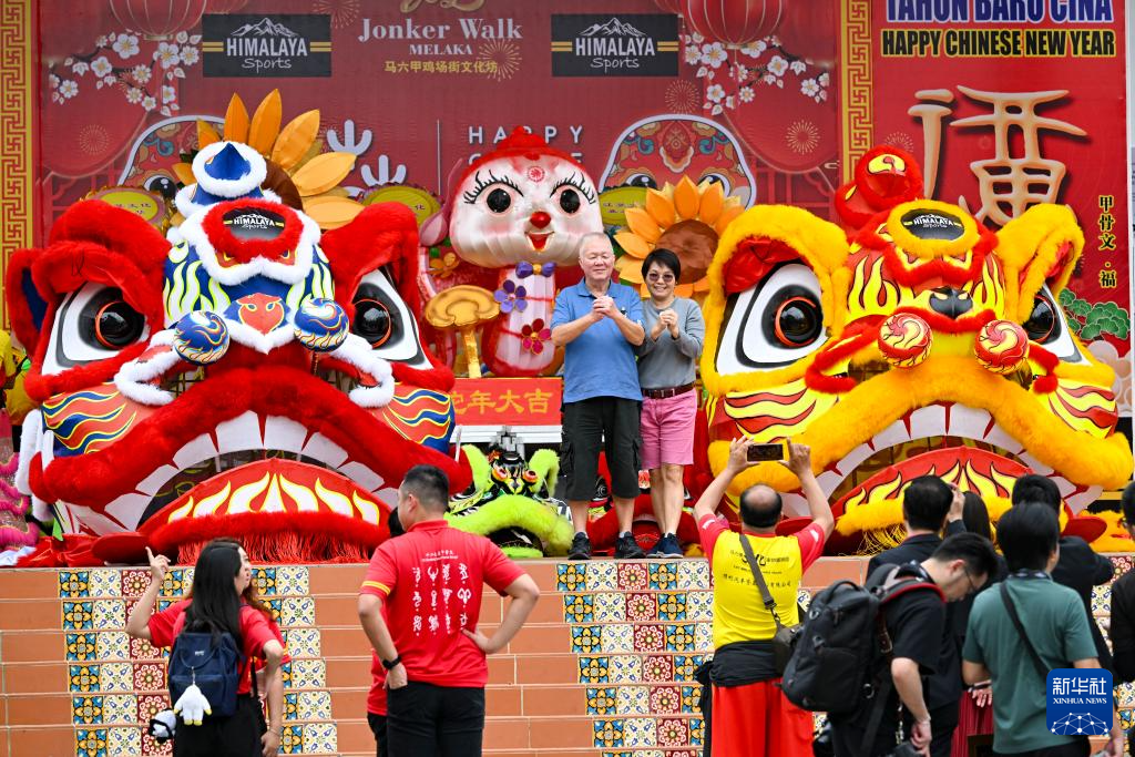1月21日,人们在马来西亚马六甲市鸡场街与“马中友谊瑞狮”合影。