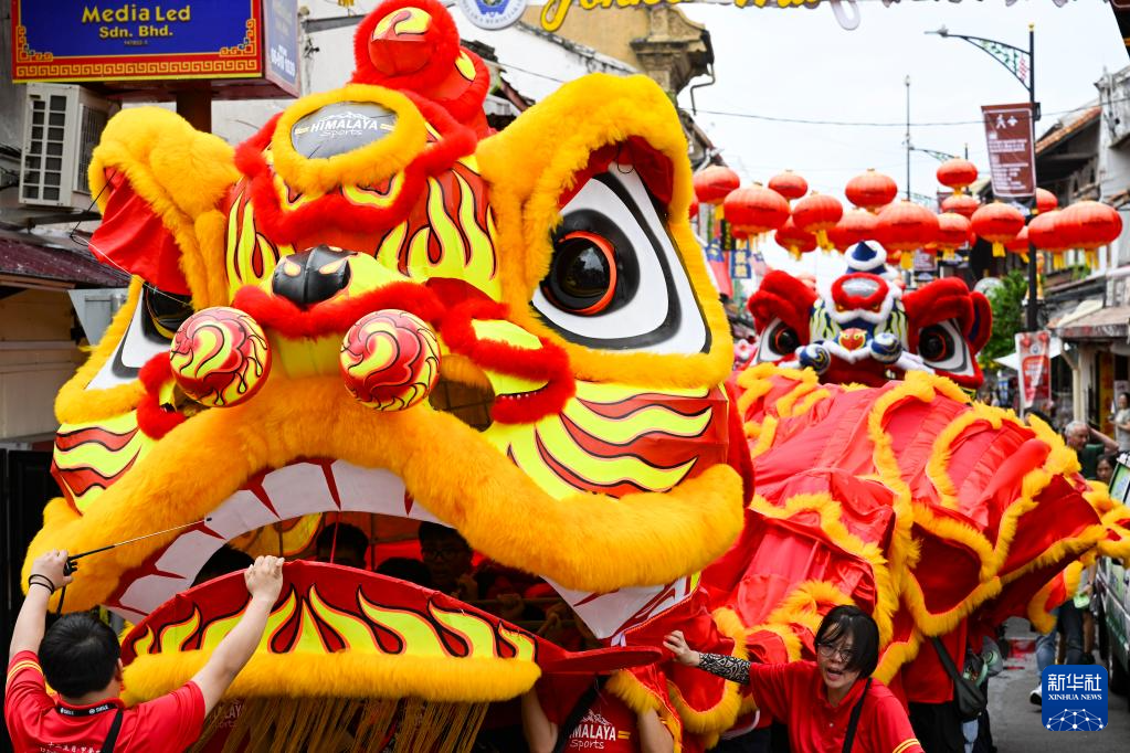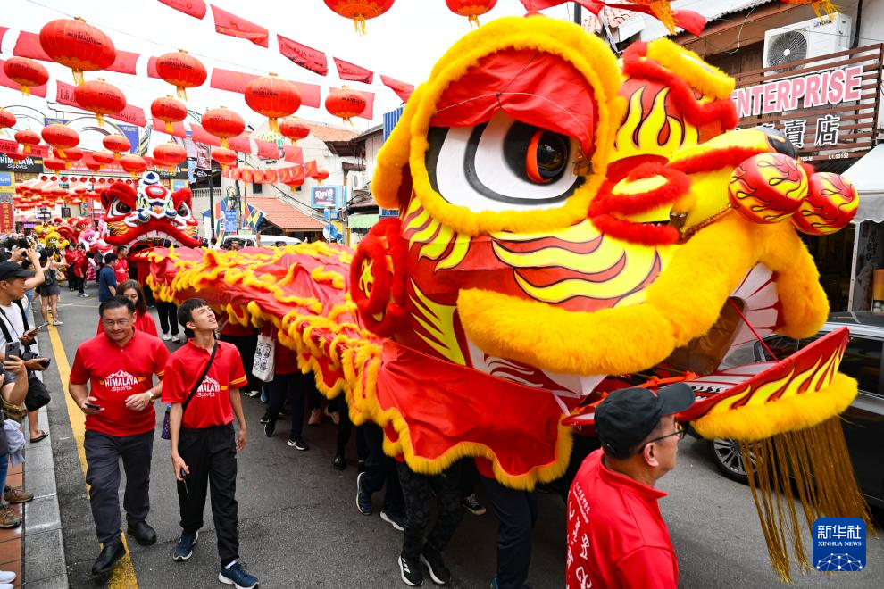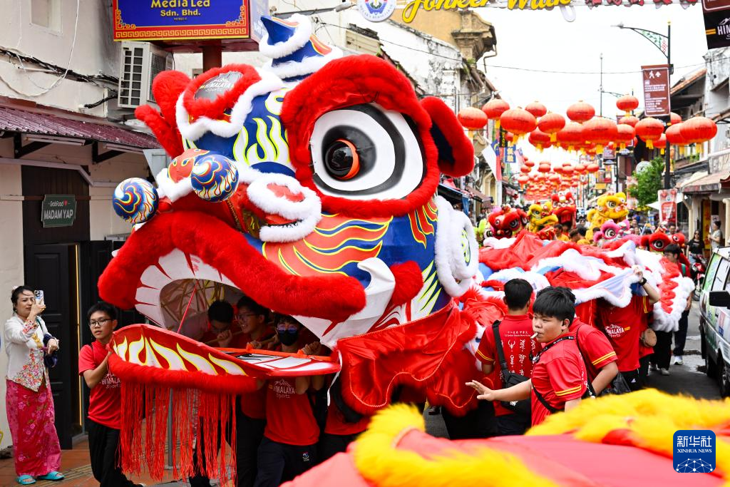 1月21日,在马来西亚马六甲市鸡场街,100人共同舞动一对“马中友谊瑞狮”,庆祝春节的到来 。