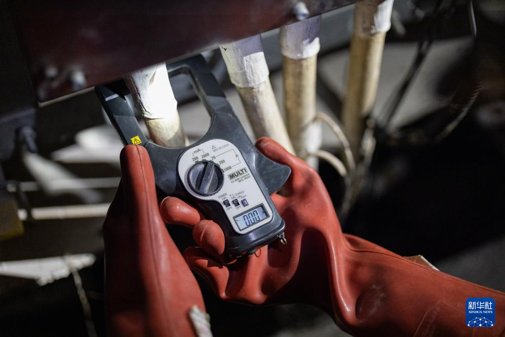 1月22日,国网重庆市区供电公司员工雷春林使用钳形环流测试仪检测电缆接地环流是否正常。