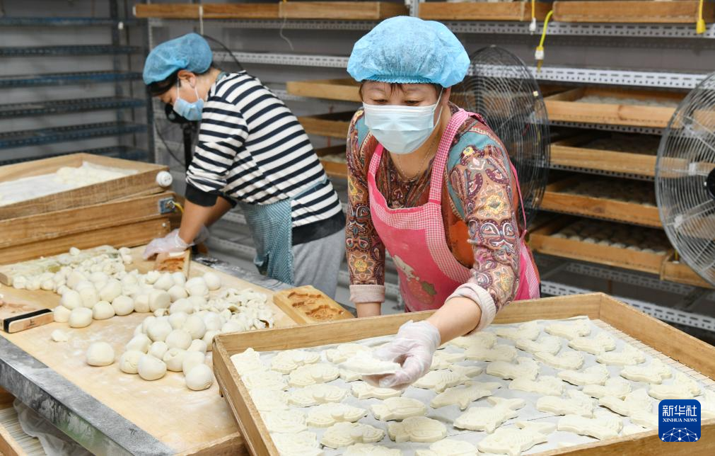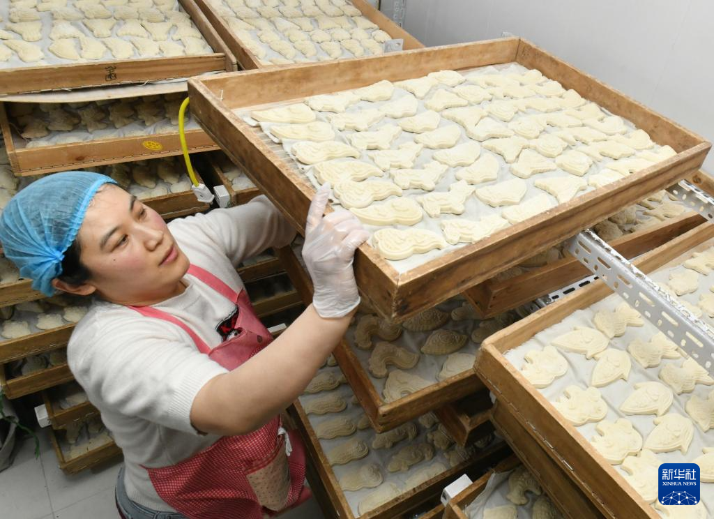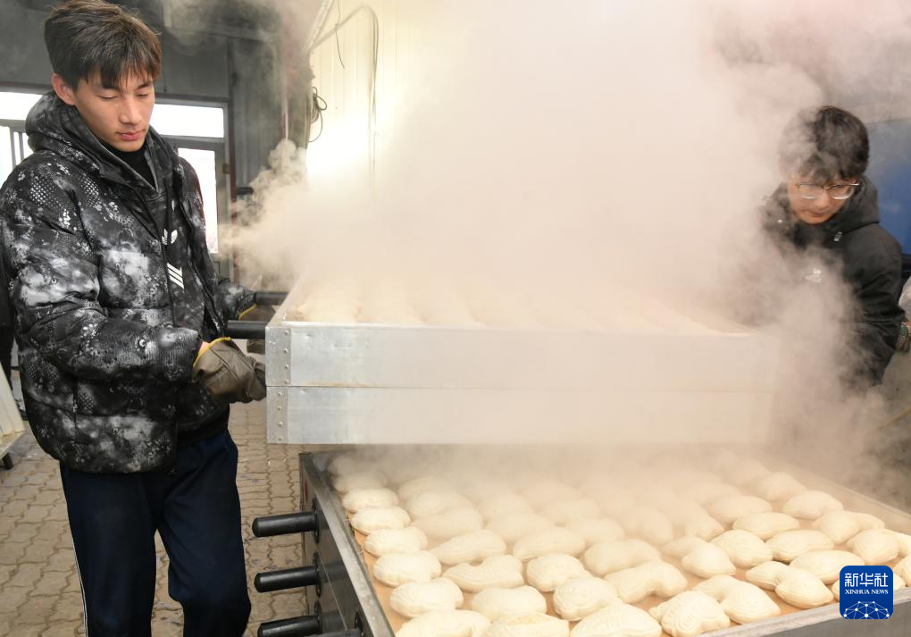 河北沧州渤海新区黄骅市有着过年蒸面花的习俗,随着春节临近,当地面花制作工厂加班加点制作面花,供应春节市场。