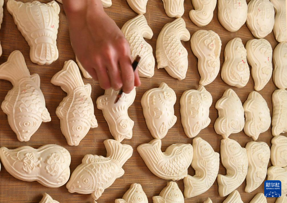 1月23日,河北沧州渤海新区黄骅市一家面花作坊的工人给刚刚出笼的面花点上寓意吉祥喜庆的红点。