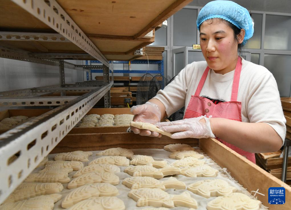 1月23日,河北沧州渤海新区黄骅市一家面花作坊的工人在准备晾面花。