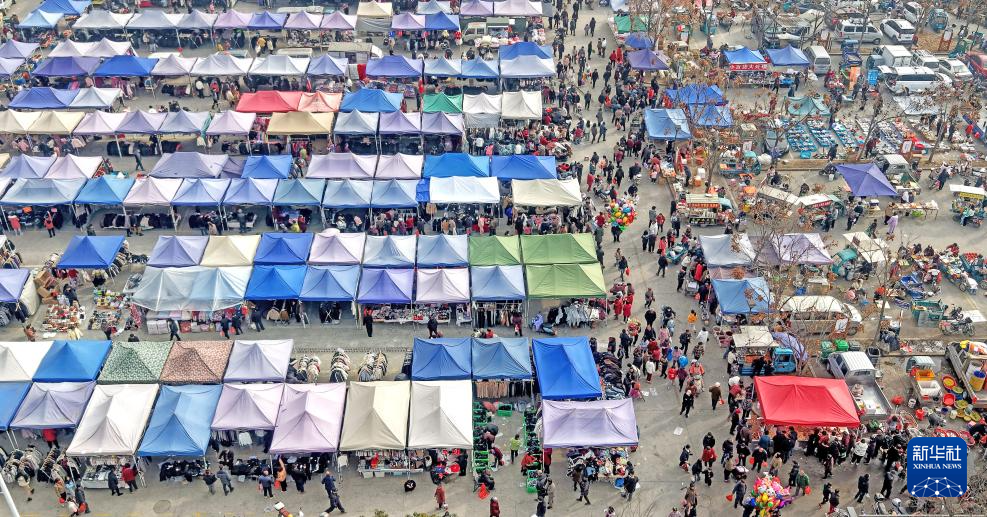1月23日,在山东省荣成市上庄镇大集,村民在购置年货(无人机照片)。
