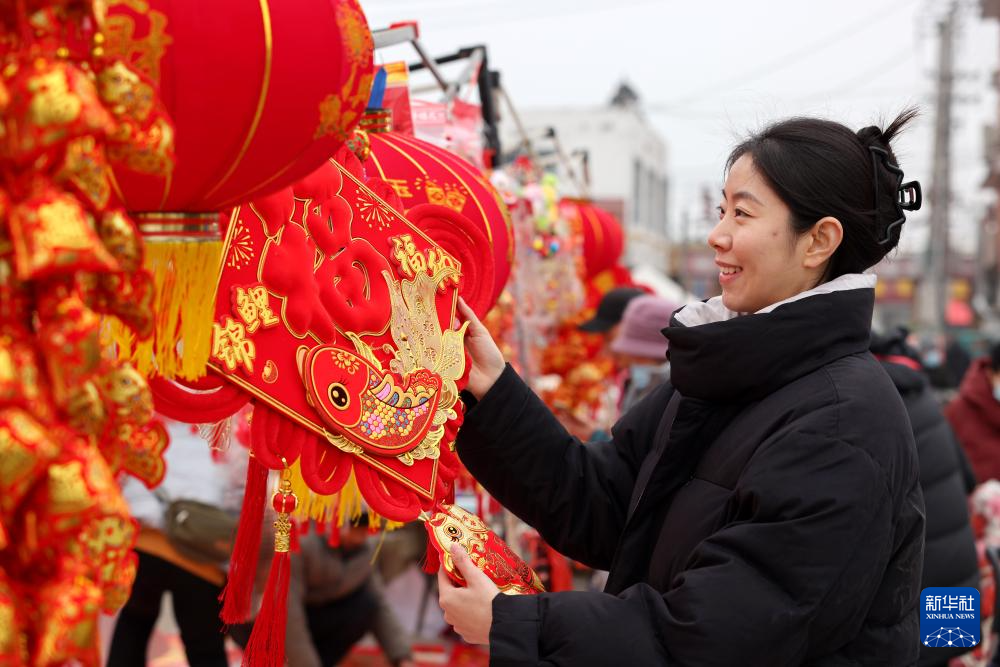 1月23日,人们在山东省枣庄市齐村年集上选购新年饰品。