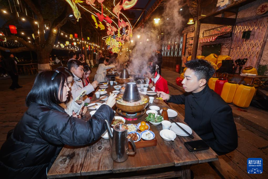 1月23日,游客在乌镇景区内品尝江南特色长街宴。