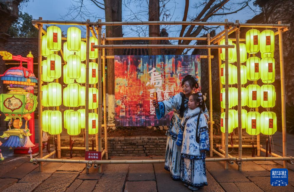 1月23日,游客在乌镇西栅景区内的传统组灯前拍照合影。