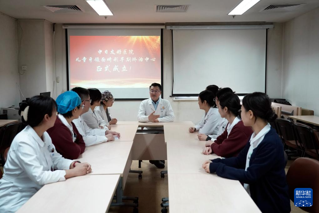 1月23日,中日友好医院儿童牙颌面畸形早期矫治中心主任徐宝华医生(中)与医护人员交流。