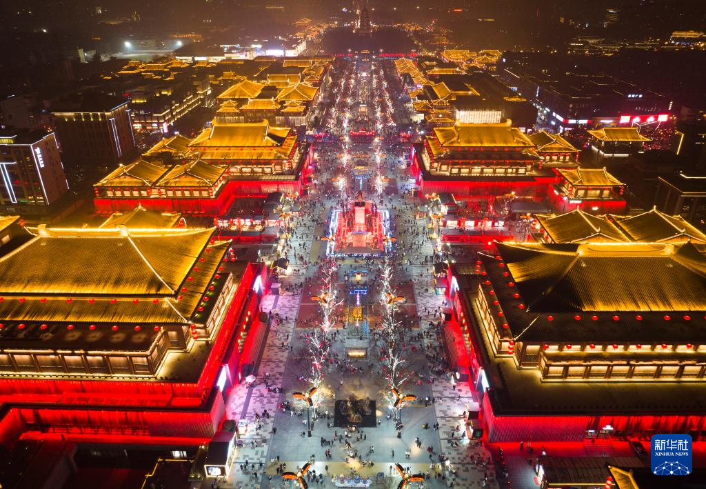 西安大唐不夜城景色(1月22日摄,无人机照片)。