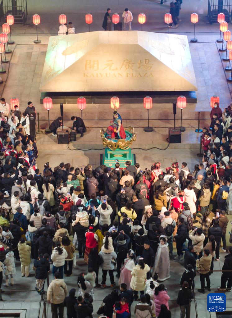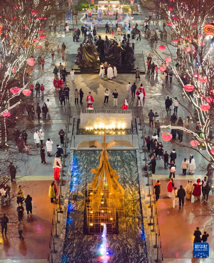 市民游客在西安大唐不夜城观看表演(1月22日摄,无人机照片)。