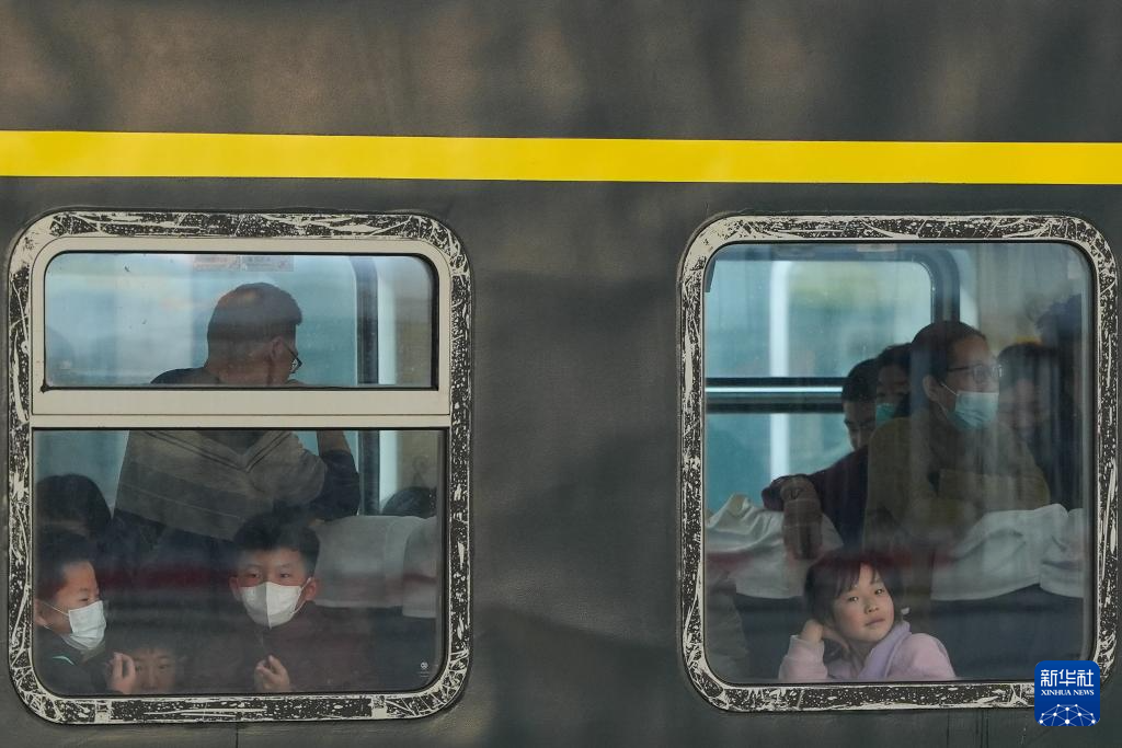 1月24日,在北京火车站,从哈尔滨西开往北京的K340次列车抵达,几名小朋友向车外张望。