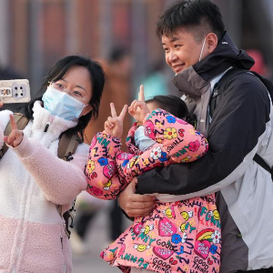 1月24日,一名小朋友(中)在北京站广场上和家人拍照留念。她跟着在深圳工作的父母乘火车来到北京,然后回唐山老家过年。