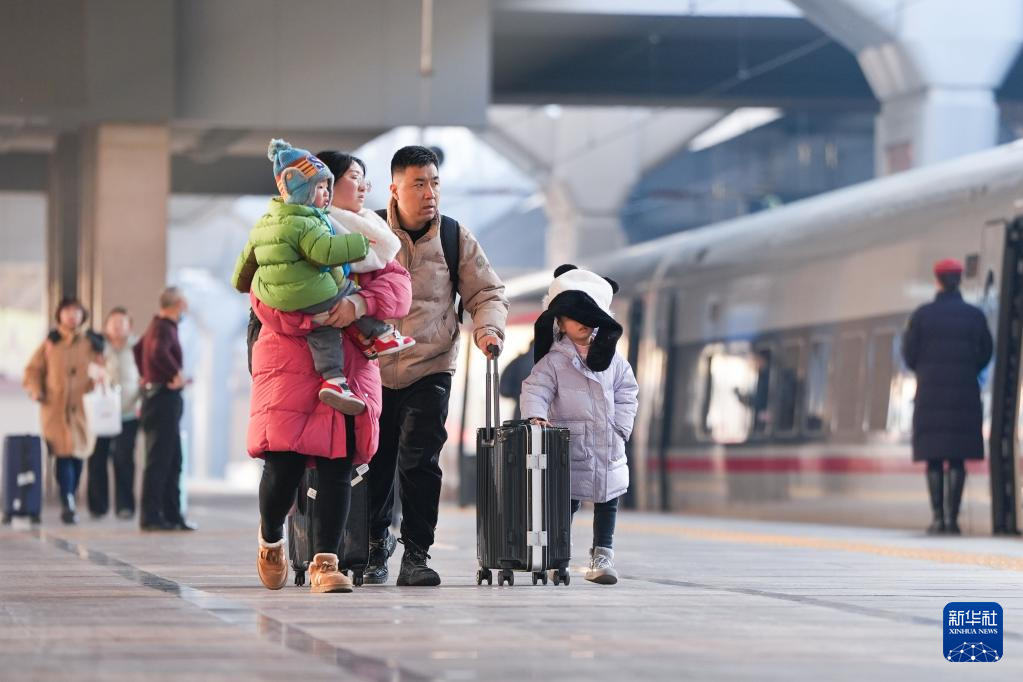 1月24日,在北京火车站,家长带着小朋友乘坐G9921次列车。