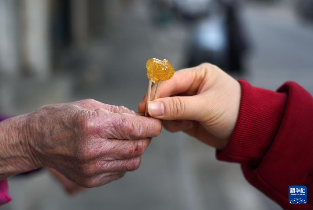 1月20日,程奶奶(左)将搅搅糖递给顾客。