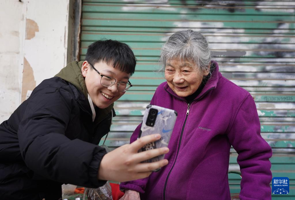 1月20日,学生在摊位前与程奶奶(右)合影留念。