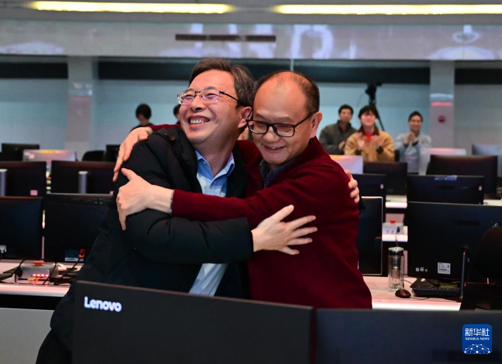 1月20日,EAST物理实验总负责人龚先祖(右)和中国科学院合肥物质科学研究院等离子体物理研究所副所长陆坤拥抱庆祝。