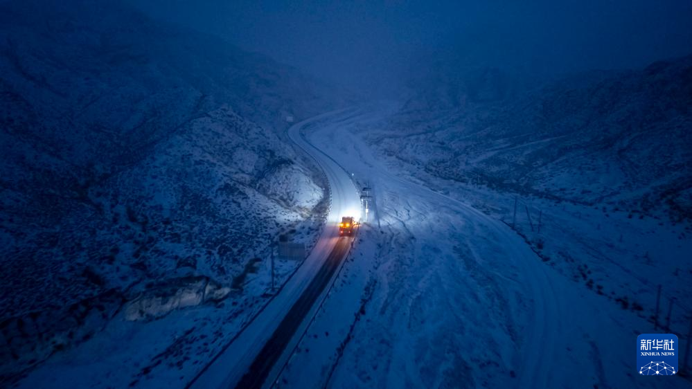 1月24日,甘肃省张掖公路事业发展中心的除雪车在国道307线开展公路除雪作业(无人机照片)。