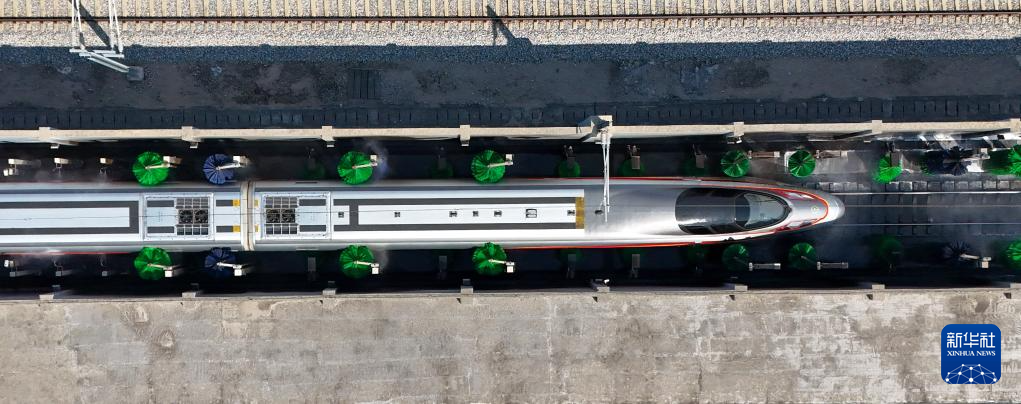 1月17日,在广州动车段深圳动车运用所,列车通过自动洗车机。自动洗车机配备有自动识别系统、喷淋系统、供水系统、水循环系统和机械洗刷系统等,能够在10分钟左右清洗完成一列16节编组高铁列车。