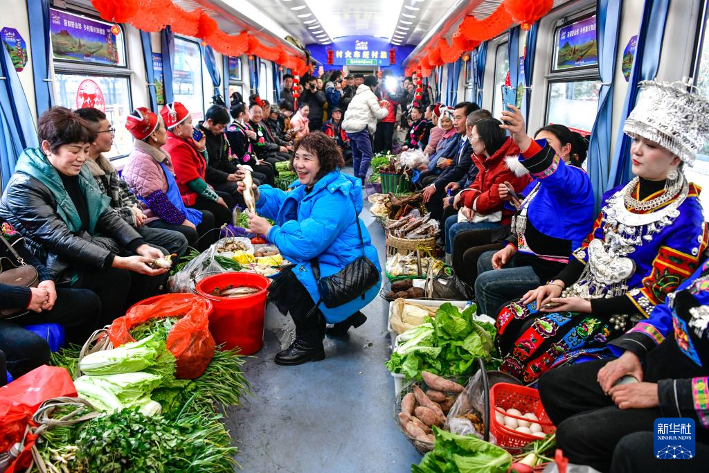 新鲜的农产品、喜庆的车厢、特色的民族歌舞、精美的非遗展示……1月18日,2025年全国乡村“村晚”示范展示活动暨“村火车上的村T村晚”启动仪式,在贵阳开往玉屏的5640次“慢火车”上举行。