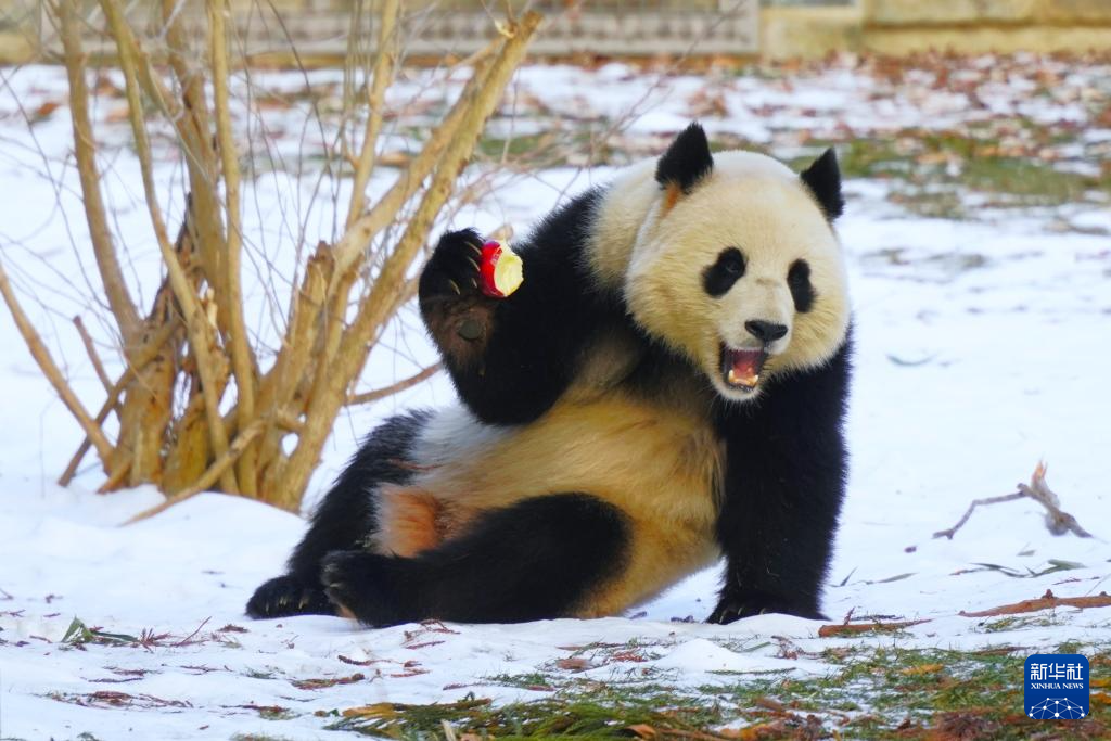 1月24日,大熊猫“青宝”在美国首都华盛顿的史密森学会国家动物园吃苹果。