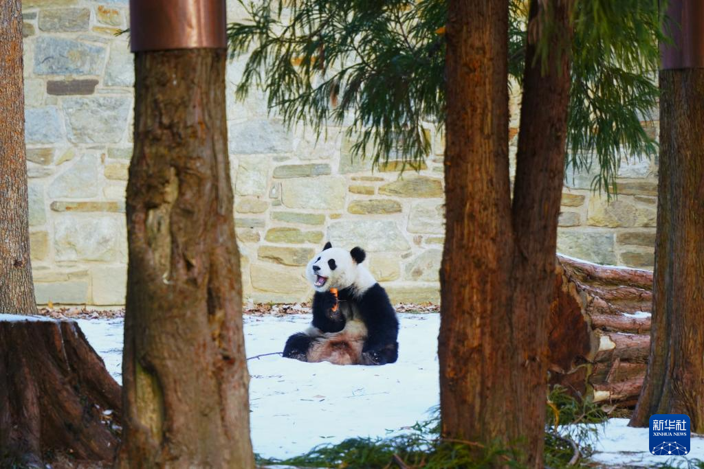 1月24日,大熊猫“青宝”在美国首都华盛顿的史密森学会国家动物园吃胡萝卜。