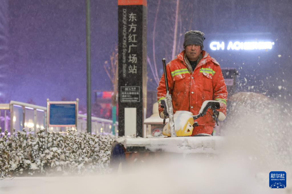 1月24日,环卫工人在甘肃省兰州市城关区东方红广场连夜清理积雪。