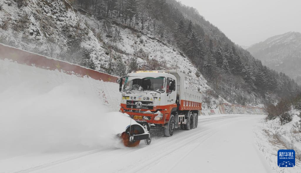 1月25日,甘肃省陇南市宕昌公路段的除雪车在省道209线南腊路上开展除雪除冰作业。