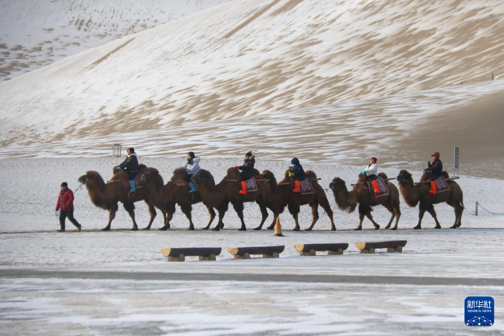 1月25日,游客在雪后游览甘肃敦煌鸣沙山月牙泉景区。