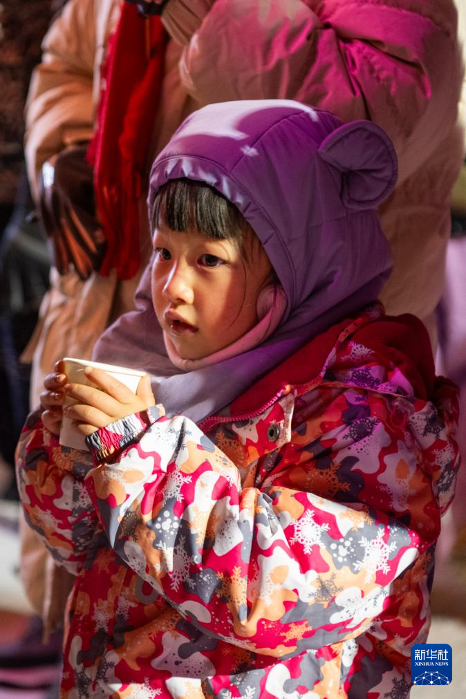 1月24日,在“中国雪乡”景区,小朋友在喝免费姜汤。