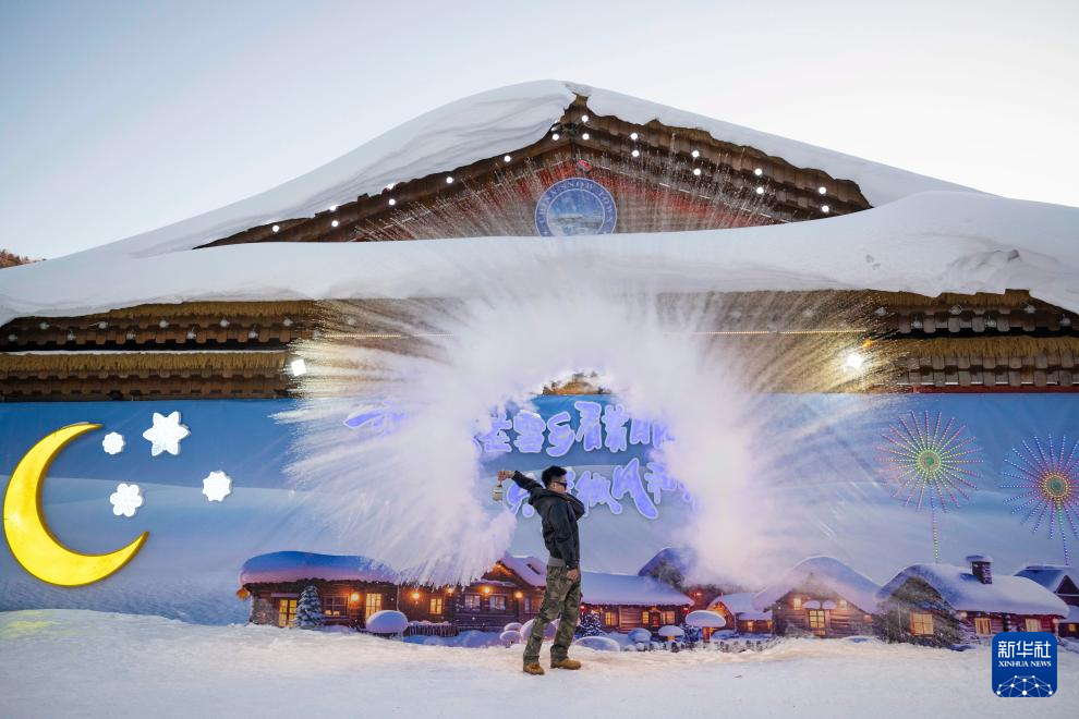 1月24日,在“中国雪乡”景区内,游客体验“泼水成冰”。