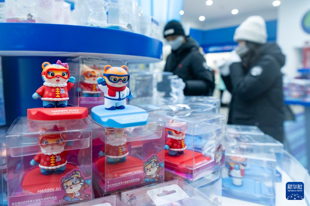 1月24日,在“中国雪乡”景区内,游客选购哈尔滨亚冬会文创产品。