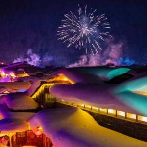 1月24日,在“中国雪乡”景区,游客拍摄烟花秀。